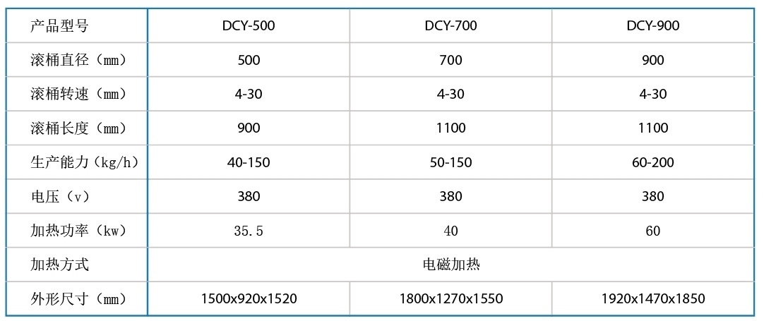 工作原理: 針輪擺線調(diào)速電機帶動小帶輪,通過三角膠帶傳動,使主軸帶動滾筒在兩個托輪的支撐下旋轉(zhuǎn),同時由電磁加熱。這樣滾筒邊旋轉(zhuǎn)邊受熱,使?jié)L筒內(nèi)的物料受熱均勻,從而達(dá)到翻炒的目的。 主要技術(shù)參數(shù)